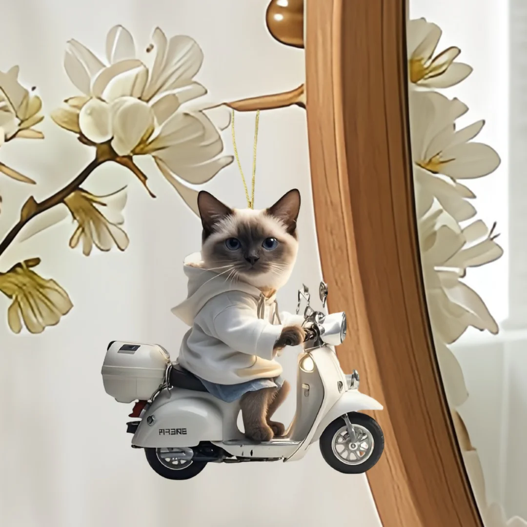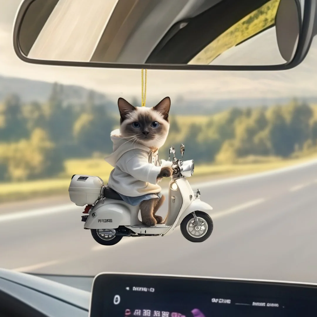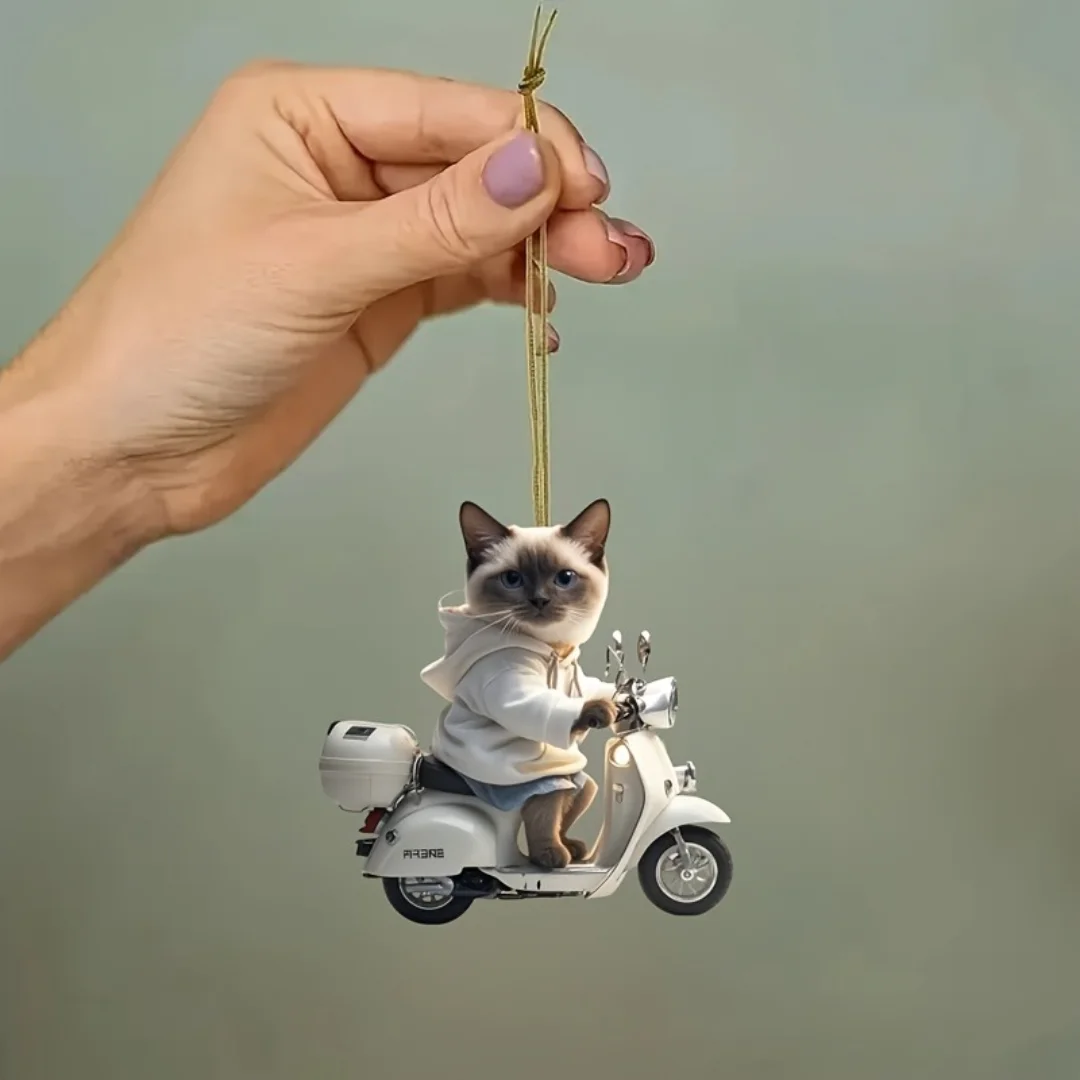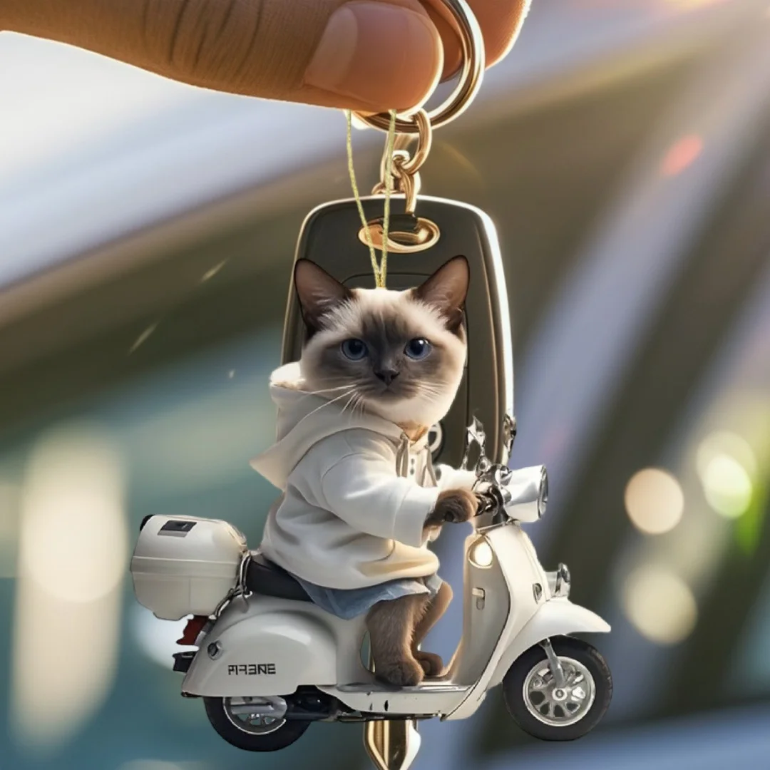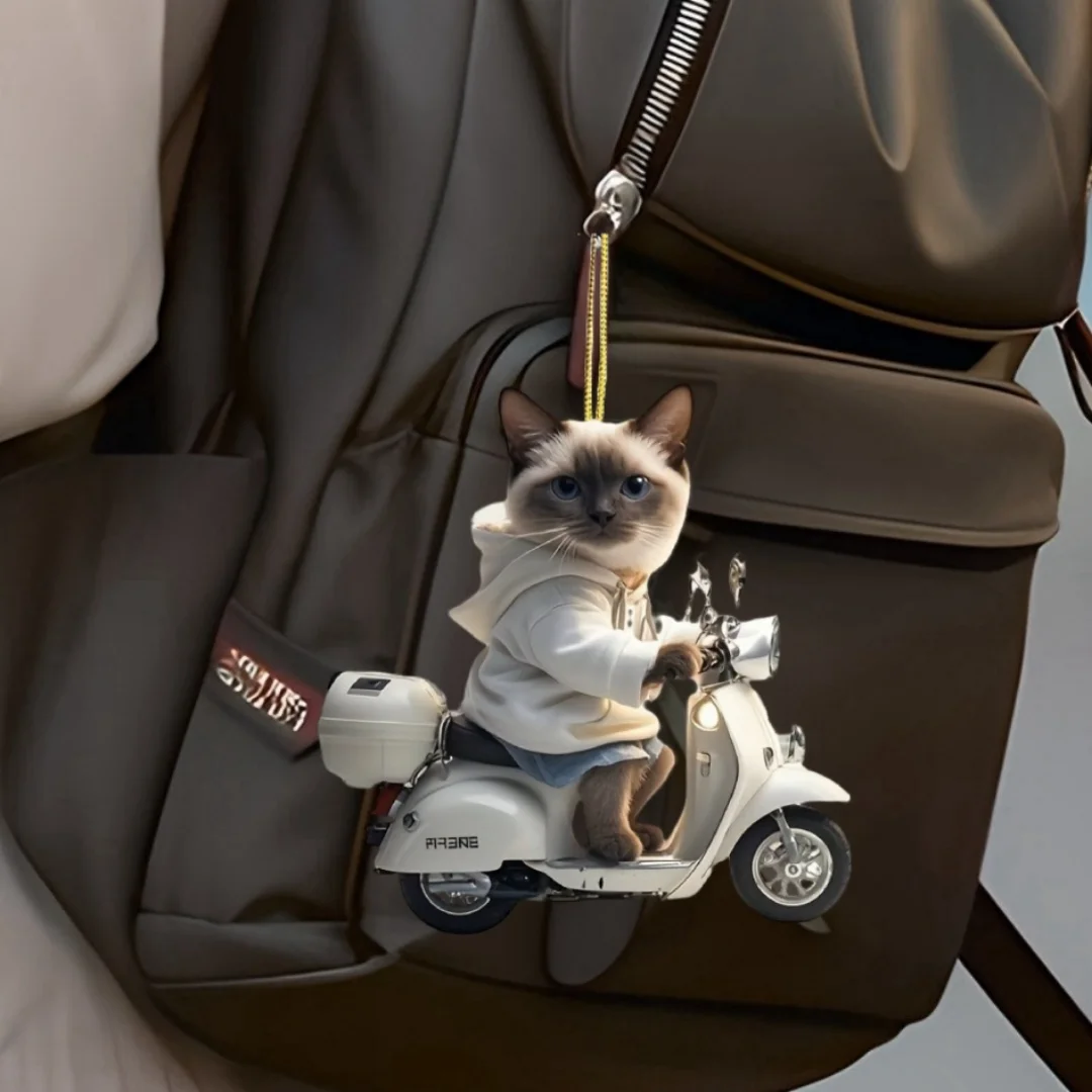 【Product name】Siamese Cat on Motorcycle Pendant Keychain,Kitten 2D Flat Acrylic Ornament,Hanging Decoration for Car,Bags,Festive,Party,Gift